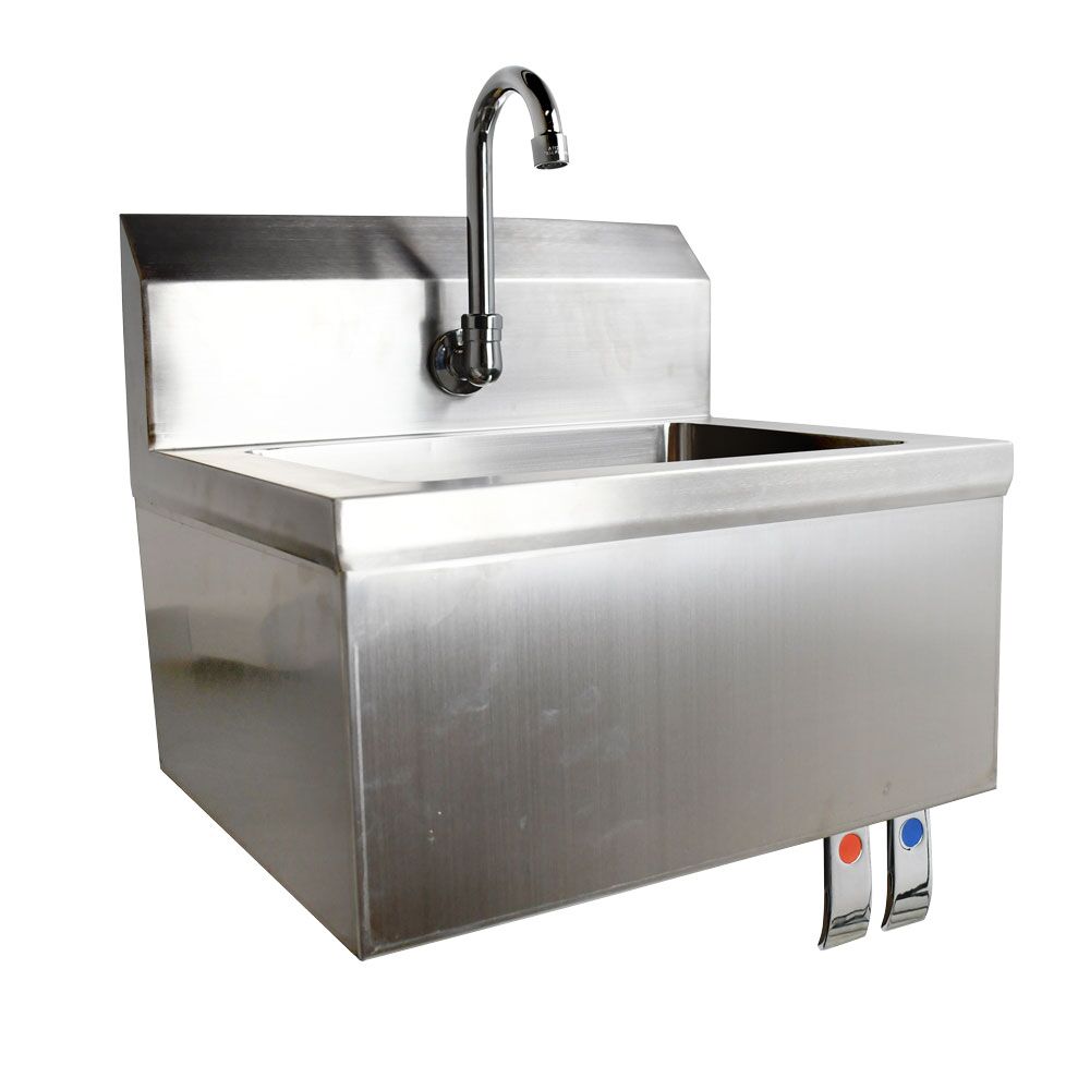 What sets this sink apart is the hands-free knee valve system, which makes handwashing quick and sanitary. Just tap the front with your knee to control the water flow—no need to touch handles with messy hands. It’s a game changer when you’re trying to keep things safe and efficient during busy service hours.
