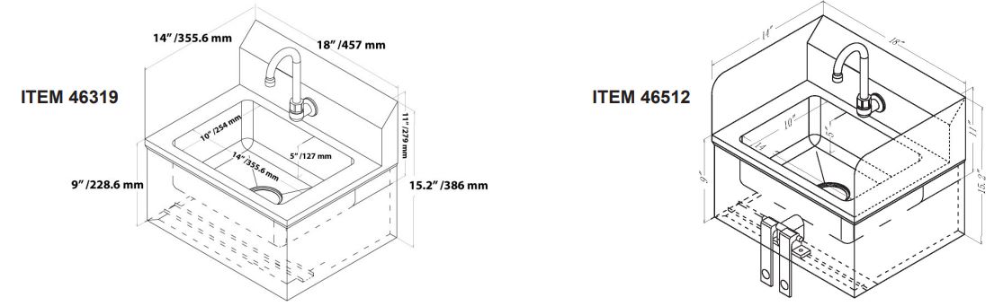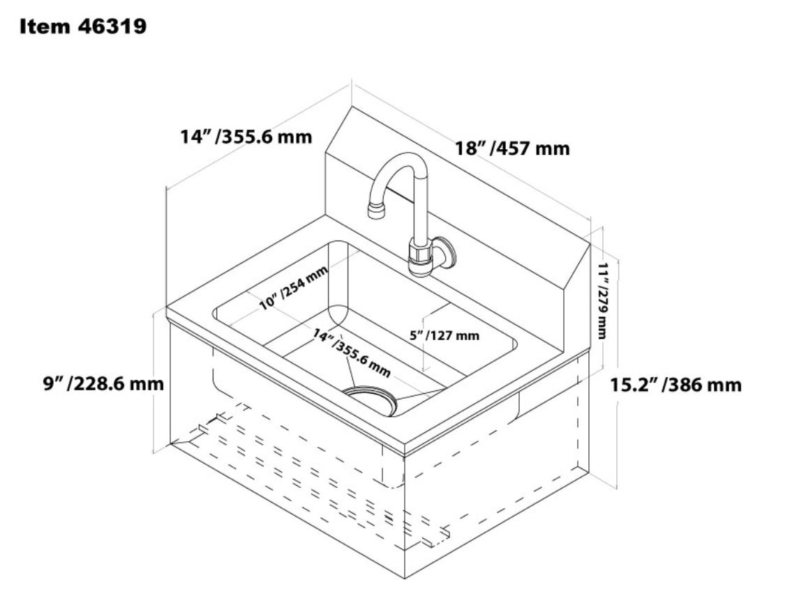 The compact wall-mount design saves valuable floor space while still offering a generous bowl size for thorough washing. It includes a gooseneck faucet, and a basket strainer to help with easy drainage and cleanup.