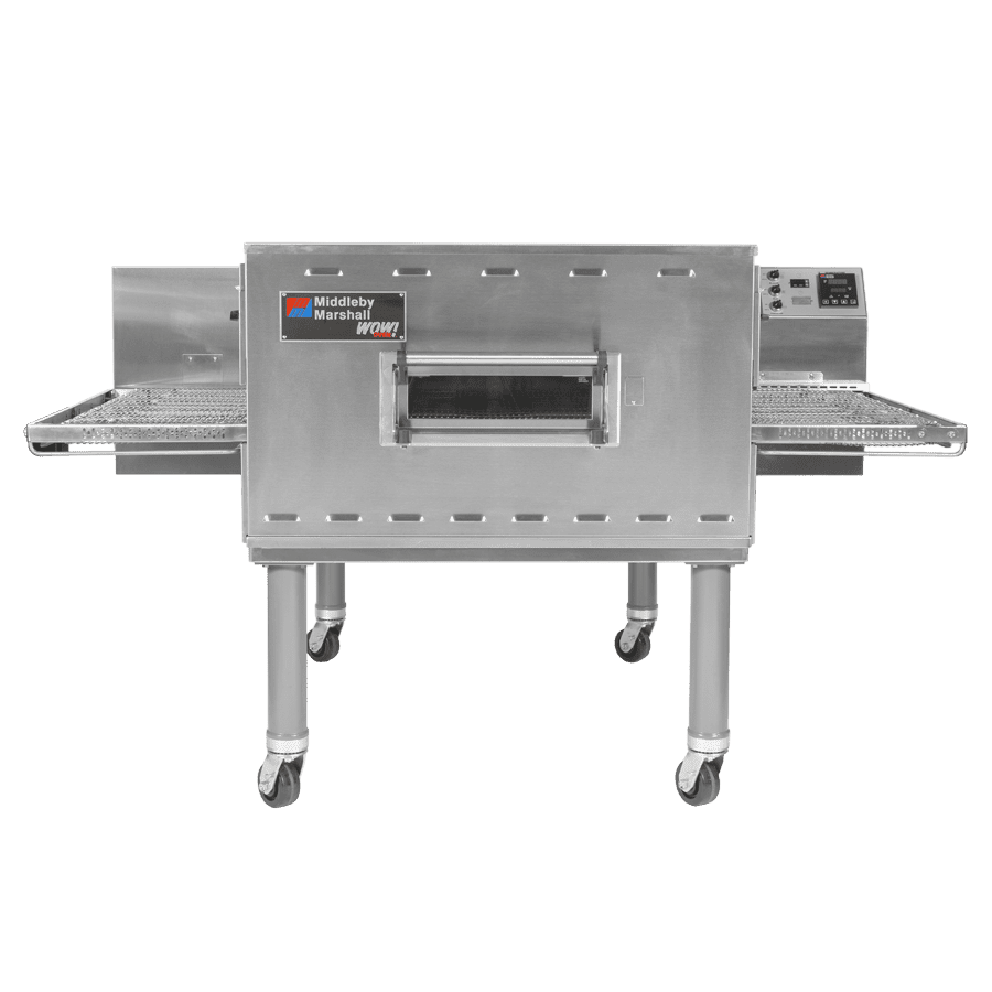 Middleby Marshall Conveyor ovens bake both faster and at lower temperatures than other ovens. Patented vertical columns of hot air move heat aerodynamically instead of using high temperatures. The streams of hot air remove the boundary layers of cool heavy air which tend to insulate the product resulting in rapid baking without burning. All Middleby Marshall ovens are designed to cook a multitude of products.