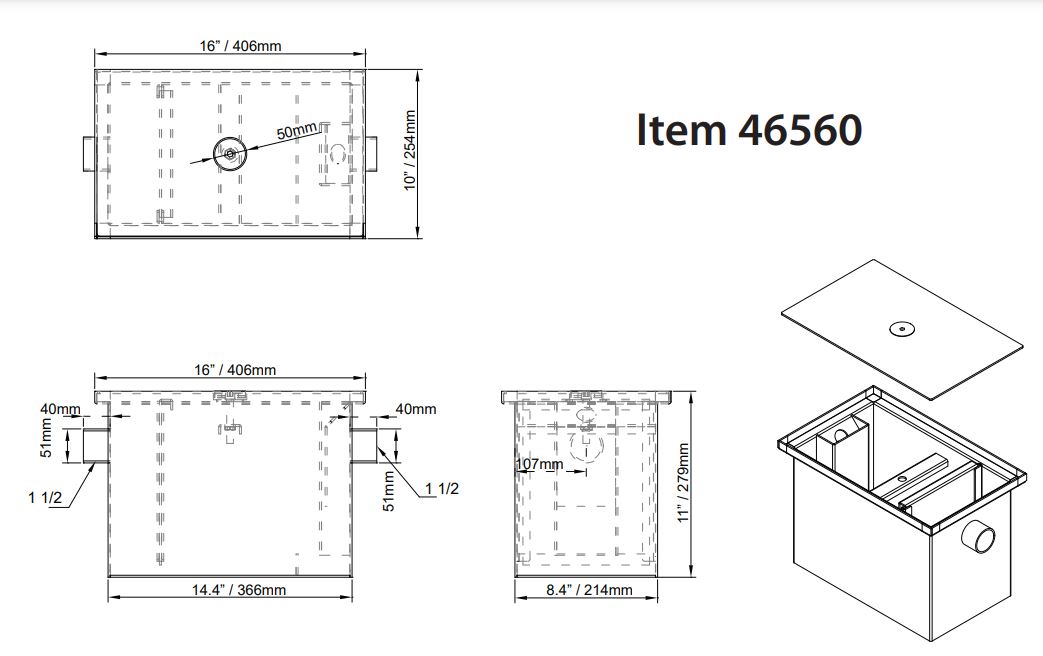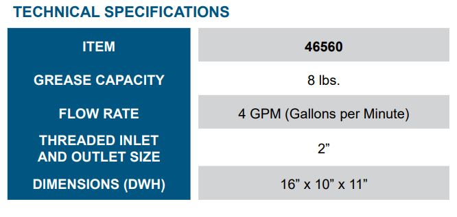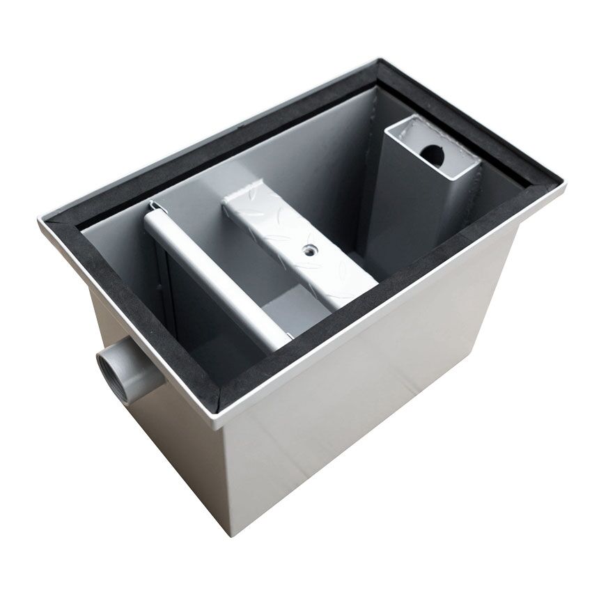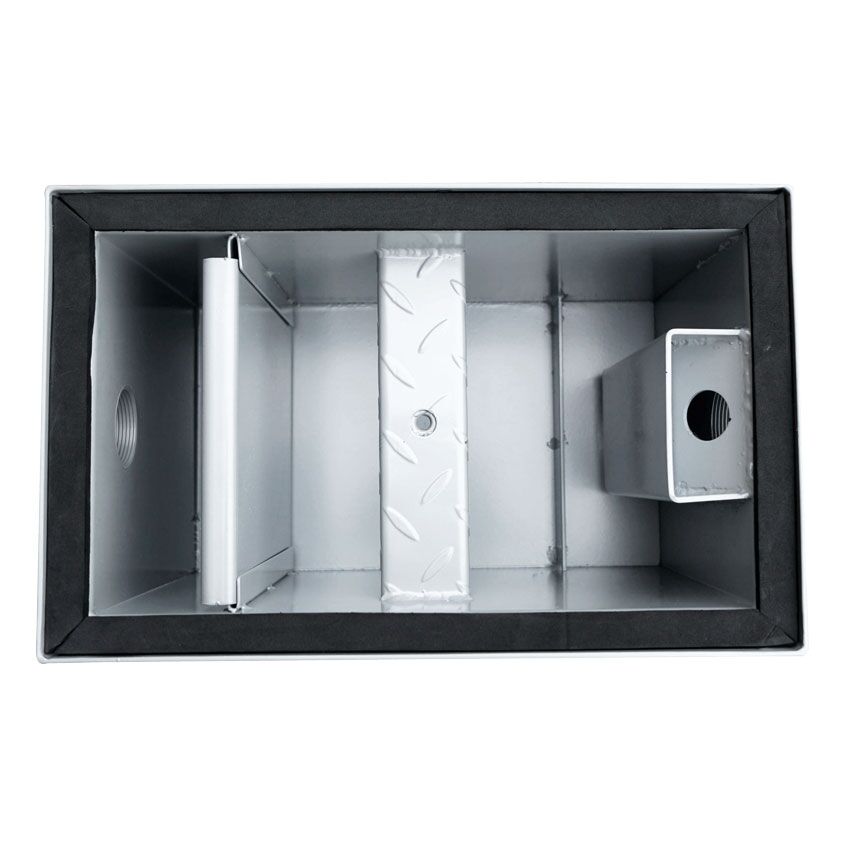 This 8 lb. capacity grease trap prevents grease from entering into plumbing system, septic fields, and wastewater facilities. This grease trap is built to last; made from 11-gauge cold rolled steel with an oven-cured and acid-resistant baked gray epoxy coating. Ideal use for cooking or prep sinks, pot sinks, or commercial dishwashers in various types of commercial food service operations. May be recess mounted or floor mounted.