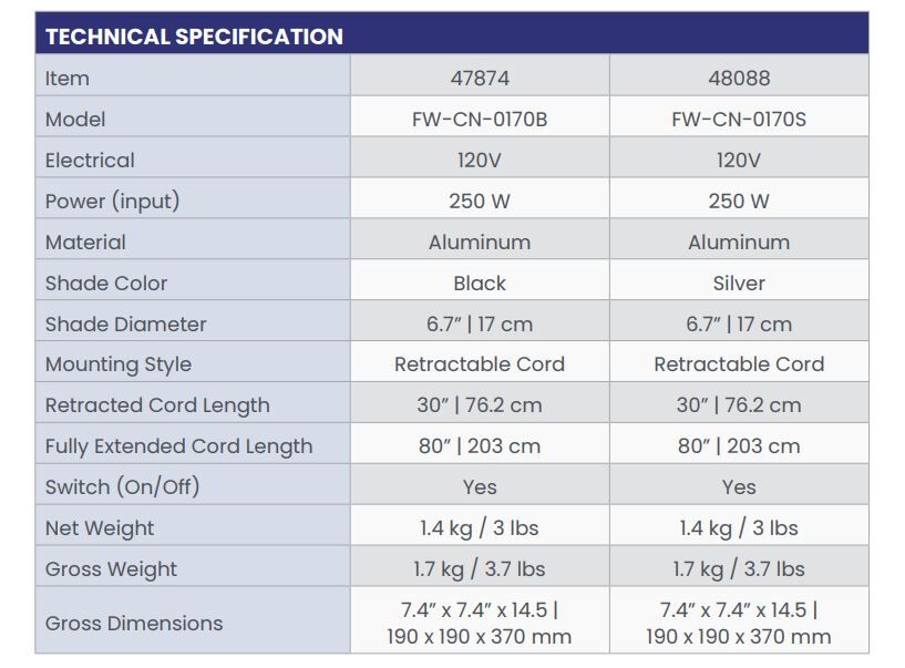 Heat Lamp – Ceiling Mount – 30″-80″ Retractable Cord with Black Dome Shade 47874 Features: