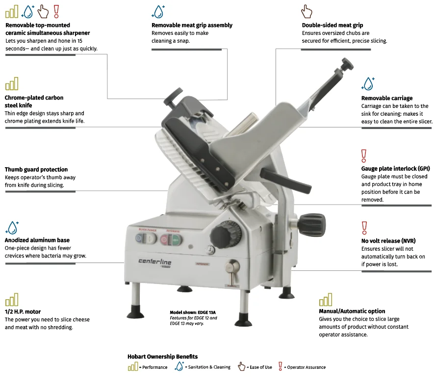 The Centerline™ Edge Series Slicer is efficient, economical and easy to clean. In so many ways, it can give you and your operators the edge you need to keep customers coming back for more. With the added protective features, you’ll feel good about having it in the back of the store too.