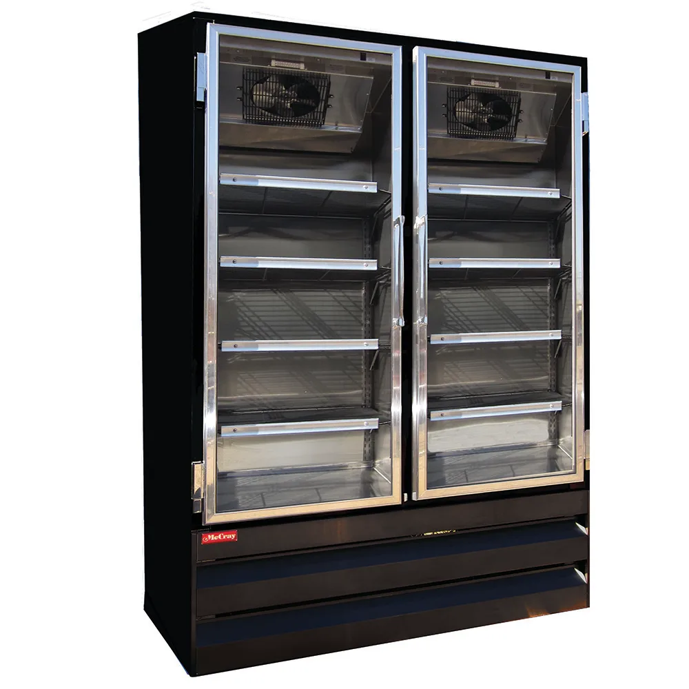 Refrigerator Merchandiser, two-section, 42 cu. ft. capacity, bottom mount self-contained refrigeration, (2) hinged glass doors, (8) epoxy coated shelves, electronic controls, audio alarm, LED interior lighting, auto defrost, white exterior & interior, R513A refrigerant, 1/3 HP, 115v/60/1-ph, 11.0 amps, cord, NEMA 5-15P, cULus, UL EPH Classified, UL-Sanitation