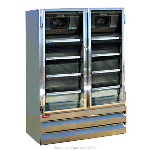 Refrigerator Merchandiser, two-section, 42 cu. ft. capacity, bottom mount self-contained refrigeration, (2) hinged glass doors, (8) epoxy coated shelves, electronic controls, audio alarm, LED interior lighting, auto defrost, white exterior & interior, R513A refrigerant, 1/3 HP, 115v/60/1-ph, 11.0 amps, cord, NEMA 5-15P, cULus, UL EPH Classified, UL-Sanitation