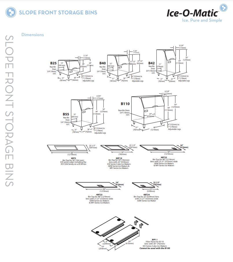 The Ice-O-Matic B40 is a slope-front ice storage bin that is 30″ wide and has a maximum capacity of 344 pounds. It has a convenient design with an extra-large door and a built-in scoop holder so you don’t have to digging around for the ice scoop.