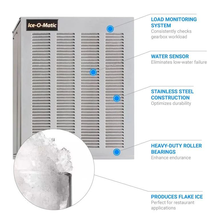 To provide your kitchen or prep area with a long-lasting piece of equipment, the Ice-O-Matic MFI1256A ice maker includes a number of the company’s standard features. For reliability, the SystemSafe load monitoring system consistently checks the gearbox’s workload to prevent damage and the water sensor eliminates failures caused by low or no water. Stainless steel construction on the evaporator and auger and heavy-duty roller bearings are also designed for endurance.