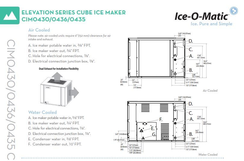 Elevation Series™ Modular Cube Ice Maker, air-cooled, self-contained condenser, dual exhaust top/side air discharge, 30″ W, approximately 435 lb production/24 hours at 70°/50° (320 lb at 90°/70°), half-size cubes, PURE ICE® built-in antimicrobial protection, LED status display, one touch sanitize/descaling controls, dishwasher safe food zone components, cULus, NSF, CE, ENERGY STAR®