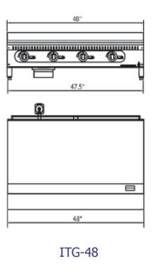The Imperial ITG-48 is a 48″ wide thermostatically controlled gas griddle with a full 24″ plate depth for more cooking surface, and a 1″ thick highly polished steel plate which will maintain even temperatures and assure quick recovery. This griddle has a total output of 120,000 BTU per hour and can be ordered for either natural gas or liquid propane.