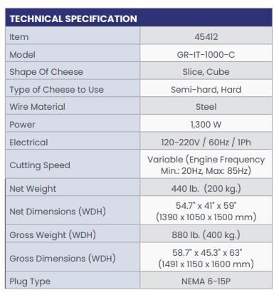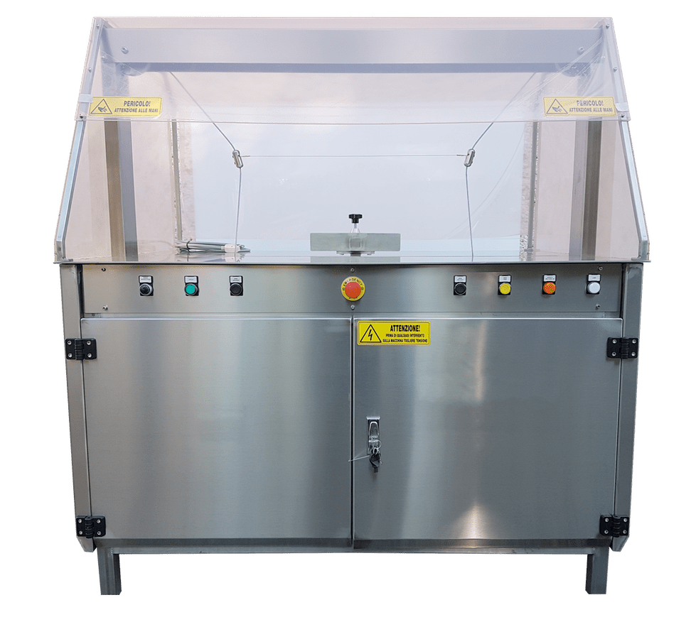 This Industrial Wire Cutting Machine for Cheese Slicing from Omcan is ideal for Cheese factories, supermarkets, distributors and companies that grate cheese and therefore need to cut it. This equipment combines high functionality with durable construction, ideal for efficient and precise cheese processing using industrial-grade wire cutters. It is built entirely from AISI 304 stainless steel which ensures robustness and easy cleaning. The machine features a twin push-button start-up for enhanced safety and ease of use, while the motor offers variable cutting speeds to accommodate different cheese textures and sizes. The work surface, also in AISI 304 stainless steel, provides a reliable and sanitary area for slicing. Additionally, it includes a food-grade Plexiglas safety housing to protect users during operation.