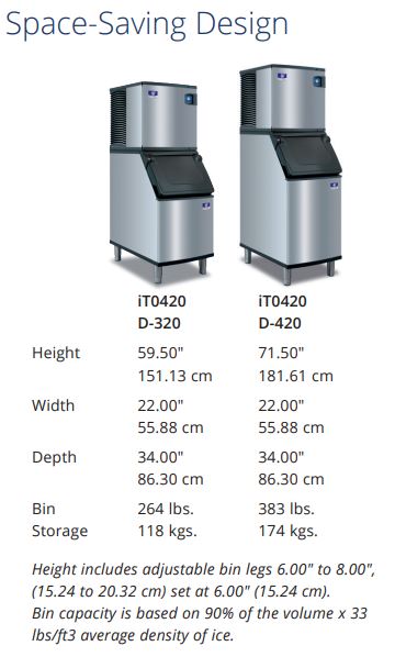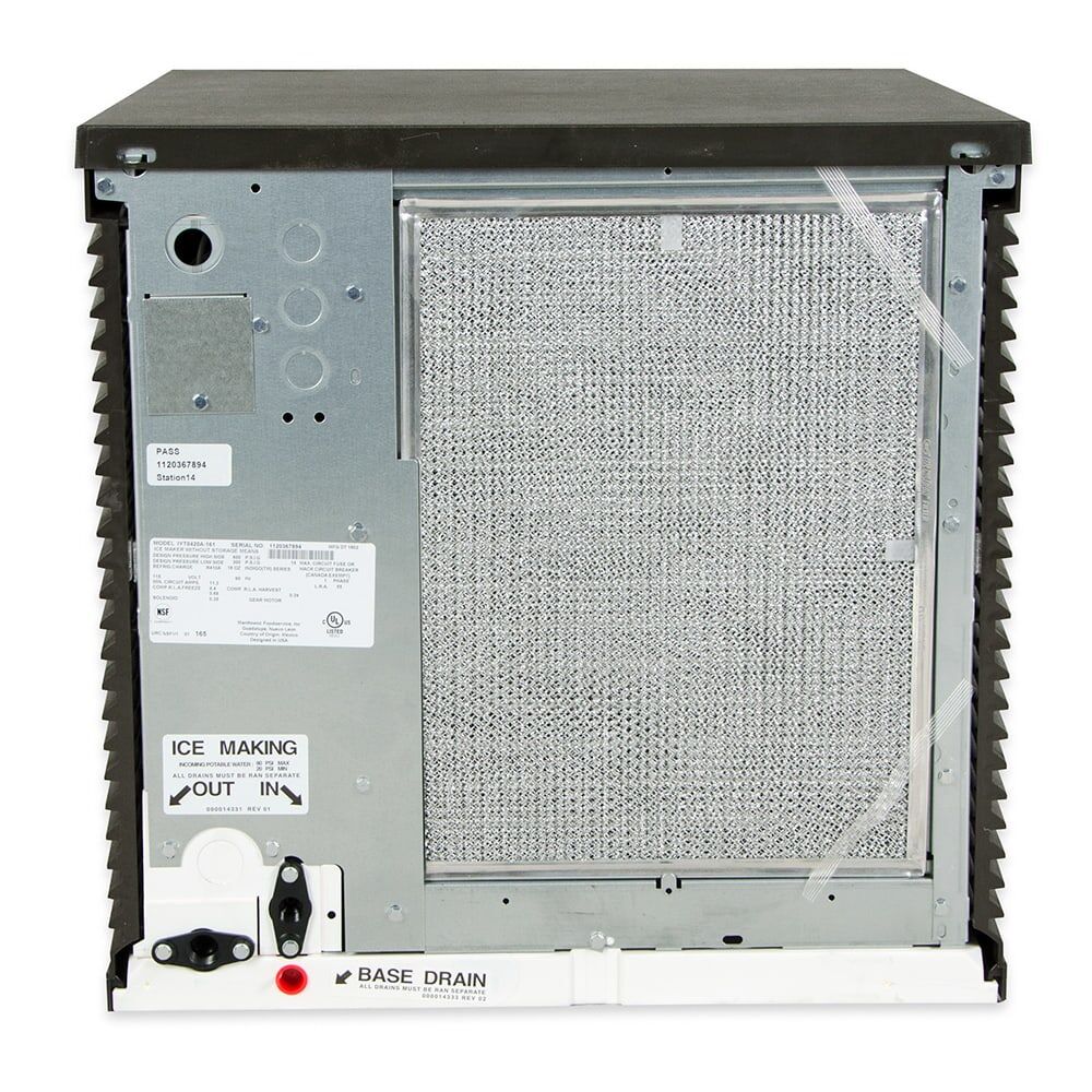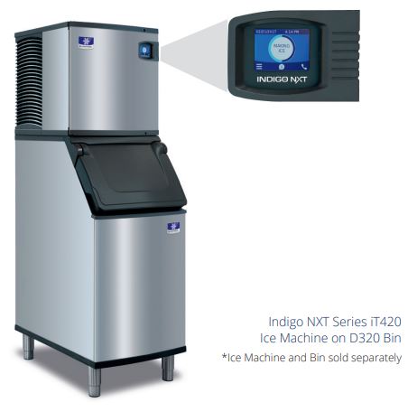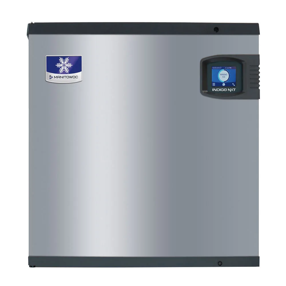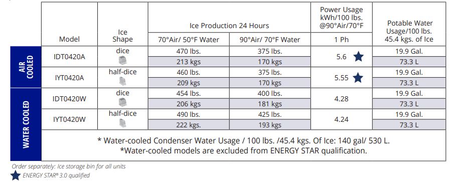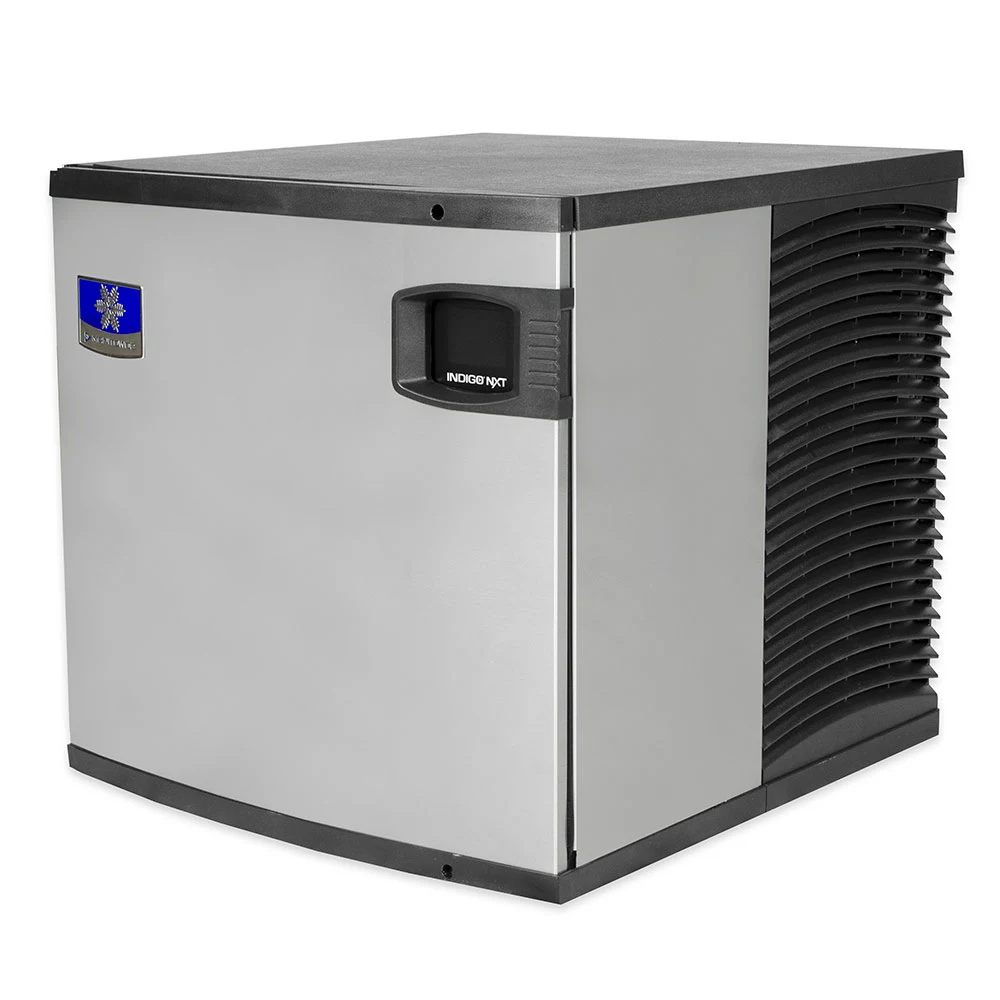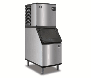 The Manitowoc Ice IDT0420A ice maker can produce 470 pounds of ice in 24 hours. This maximum amount can only be achieved if ambient air and incoming water conditions are at an ideal level. It makes full-cube ice, which is often used for soft drinks and other fountain beverages. This unit uses air to cool the refrigerant, and when it is cold, it removes heat from the evaporator plate so water will freeze and make cubes.