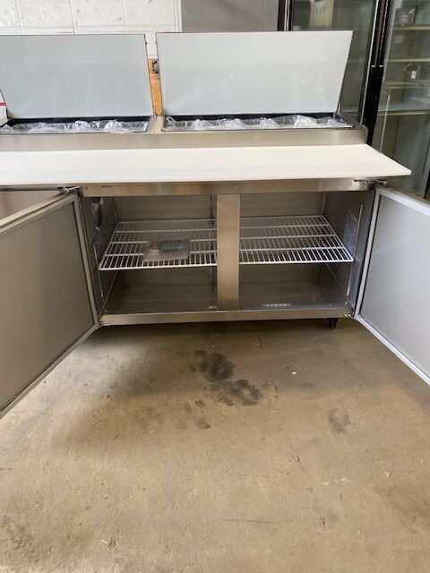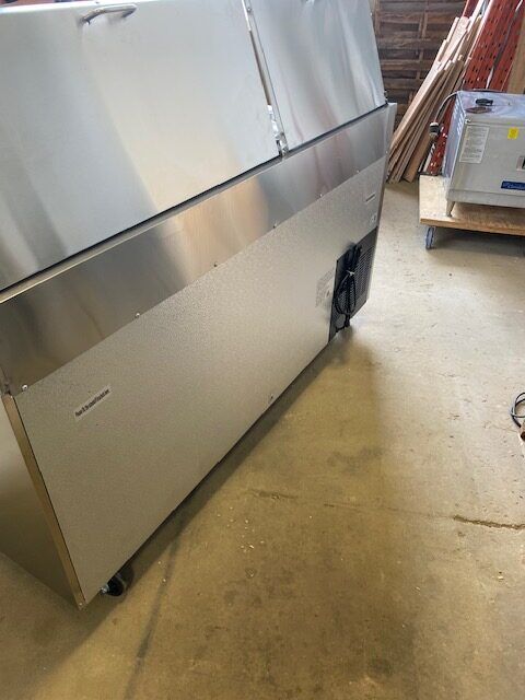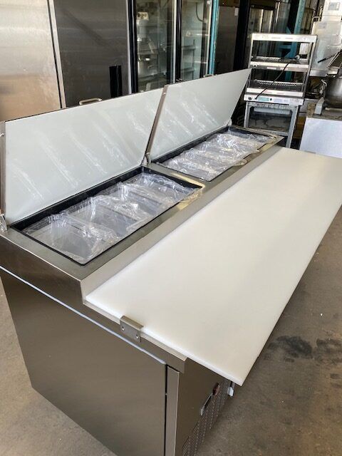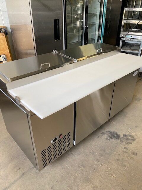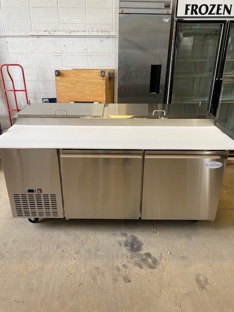You are viewing a brand new 70″ wide Refrigerated Pizza Prep Table Cooler. This Chef’s Mate model has been assembled out of the crate and includes everything from the factory. It measures 70-9/10″ W x 31-1/2″ D x 42-7/8″ H. It includes caster wheels with 2 locking wheels. Power supply is 115V. These sell new for $4,500+. We also sell other new models and have financing options. Our Clearance Warehouse is located in the Foothills Industrial Park #5, 6613 – 44th Street SE, Calgary, AB. Open Monday to Friday 9am to 4pm. All Clearance Items have a 30 day warranty unless otherwise specified.