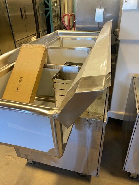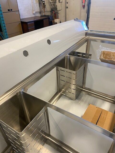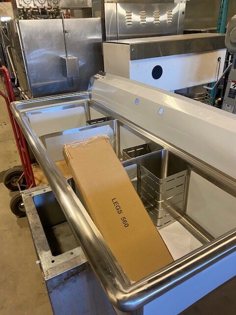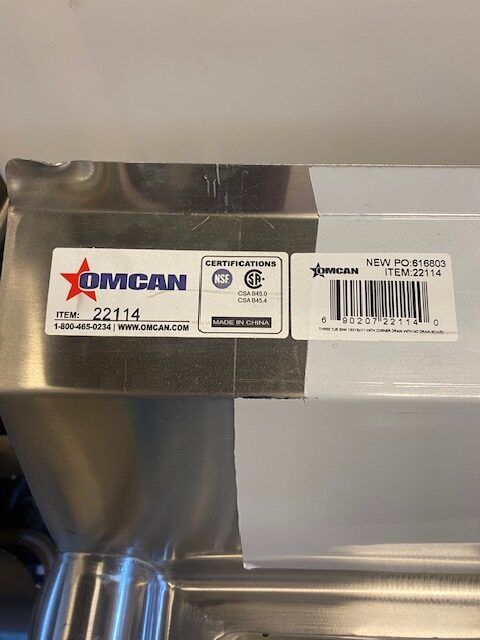 You are viewing a brand new never used stainless steel three compartment sink with corner sink drains, and drain baskets. This Omcan 22114 model is in excellent condition. There are a few very light scratches that are barely noticeable. It measures 59″ W x 23-1/2″ D x 44″ tall. The sink measures 18″ x 18″ x 11″ with a 1.8″ drain. These sell new for $1600+. We also sell other new models and have financing options. All Clearance Items have a 30 day warranty unless otherwise specified