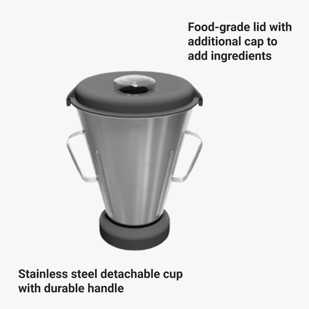 The seamless cup made of stainless steel without welding features 4 internal pressed ribs, is suitable for commercial blenders, offering advantages in various businesses due to its easy use, cleaning, and efficiency. The design allows you to prepare large, heavy recipes like creams, sauces, and soups efficiently while ensuring homogeneous processing, saving time, and increasing productivity. Its versatility, hygienic design, and ability to process both hot and cold recipes make it a valuable tool for various kitchen settings.