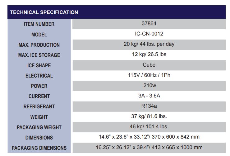Omcan ice maker has the capacity to store up to 26.5 pounds of ice at one time. It produces cube-shaped ice with adjustable thicknesses that can be modified with an easy-to-use control panel. A convenient ice scoop is included for collecting ice from the storage bin while also preventing contamination. A perfect fit for any restaurants, cafeterias, or break rooms.