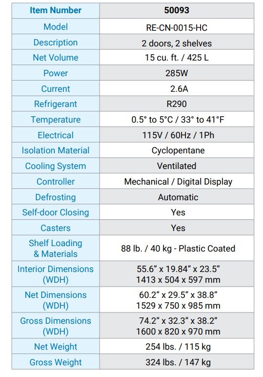 NET VOLUME (CU. FT): 15 cu.ft/ 425 L