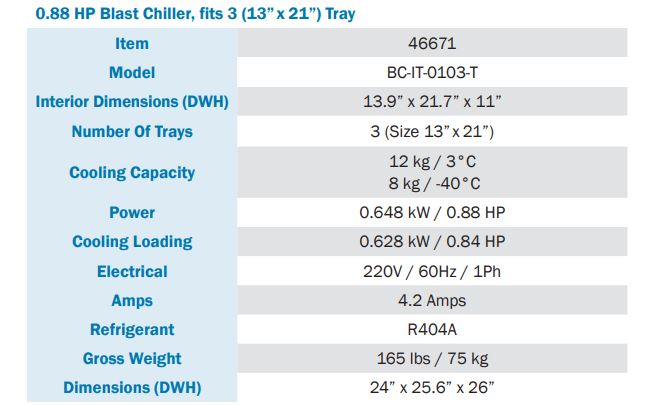 Blast Chillers cool food rapidly by circulating cold air through the unit until temperature falls down to safe levels. These units are designed to quickly lower the temperature of foods to minimize bacterial growth ensuring food down through the danger zone within minutes compared to the hours it takes when stored in a refrigerator. Blast chillers also offer an advantage over traditional freezer by rapid freezing the food which produces fewer and smaller ice crystal resulting with minimal damage to the food.