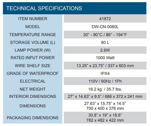 Serve your customers fresh, warm products with Omcan’s DW-CN-0080L and DW-CN-0115L display warmers. Perfect for convenience stores, cafes, and small delis. They feature stainless steel construction with hinged glass doors. They also have adjustable temperature controllers to precisely control the best temperature for your foods. Non-adjustable chrome plated shelves included.