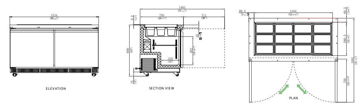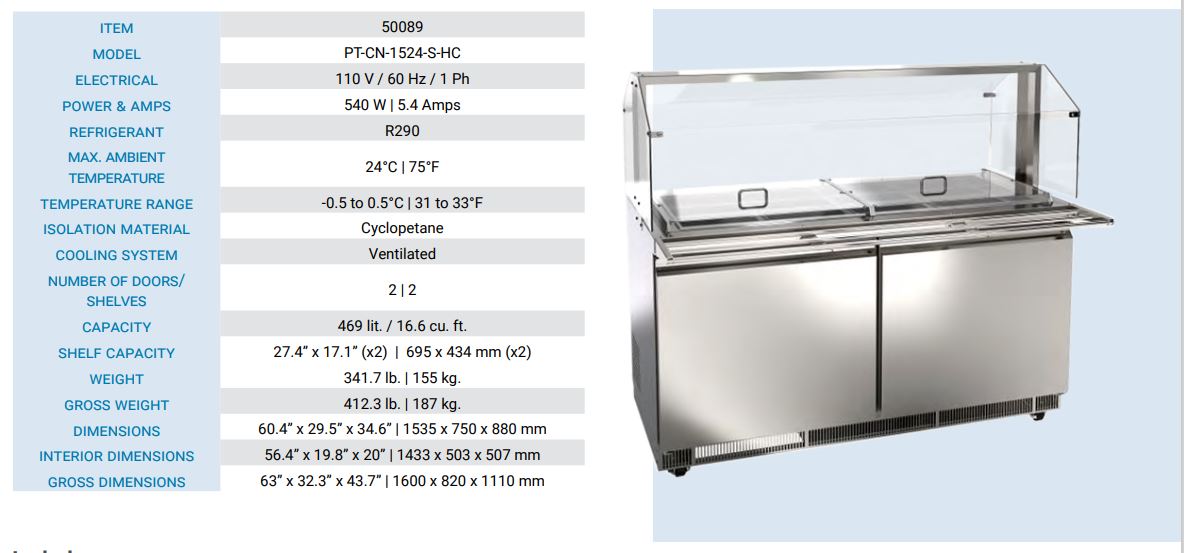 This unit has ample refrigerated storage underneath to keep food refills within reach, with a storage area of 56.4″ x 19.8″ x 20″. Easily access the storage area even during busy service with two conveniently placed doors. The refrigerated storage includes 2 plastic-coated steel shelves of size 27.4″ x 17.1″ having a loading capacity of 40 kg/90 lbs each.
