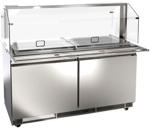 The Omcan refrigerated salad bar is a must have equipment for buffets and self-service areas. This unit comes with a kit comprising sneeze guard, tray slide, 2 pan covers and 12 1/3 GN pans. The unit is extremely spacious and can hold upto 12 1/3 GN pans or 24 1/6 GN pans of 6″ depth. There are 4 full size pan slots that can be adjusted to accommodate various combinations of pan sizes.