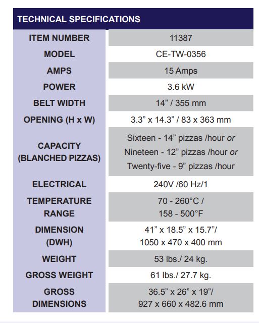 CAPACITY: Nineteen – 12″ pizzas /hour or Twenty-five – 9″ pizzas /hour