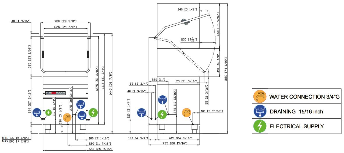 DIMENSIONS (WDH): 28 3/8” x 28 15/16” x 56 7/8” (74 1/16” Height (open hood))