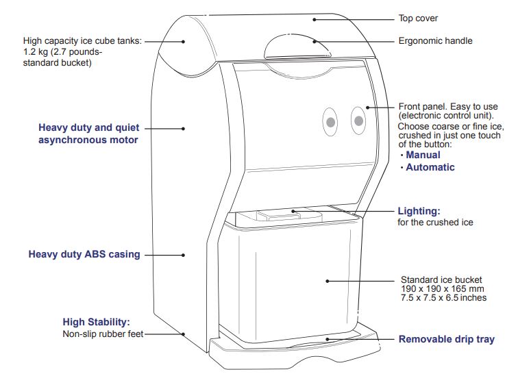 This commercial appliance crushes all ice from your ice machine. Fine or coarse crushed ice for cocktail bars, restaurants, night clubs. Use the standard international ice bucket to make your service easier. Simply and quickly makes 1.2kg/ 2.7pounds of crushed ice in 30 seconds (approx. 150 kg per hour).