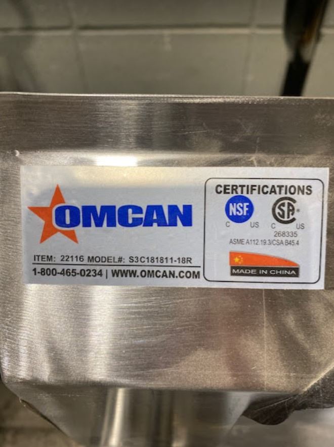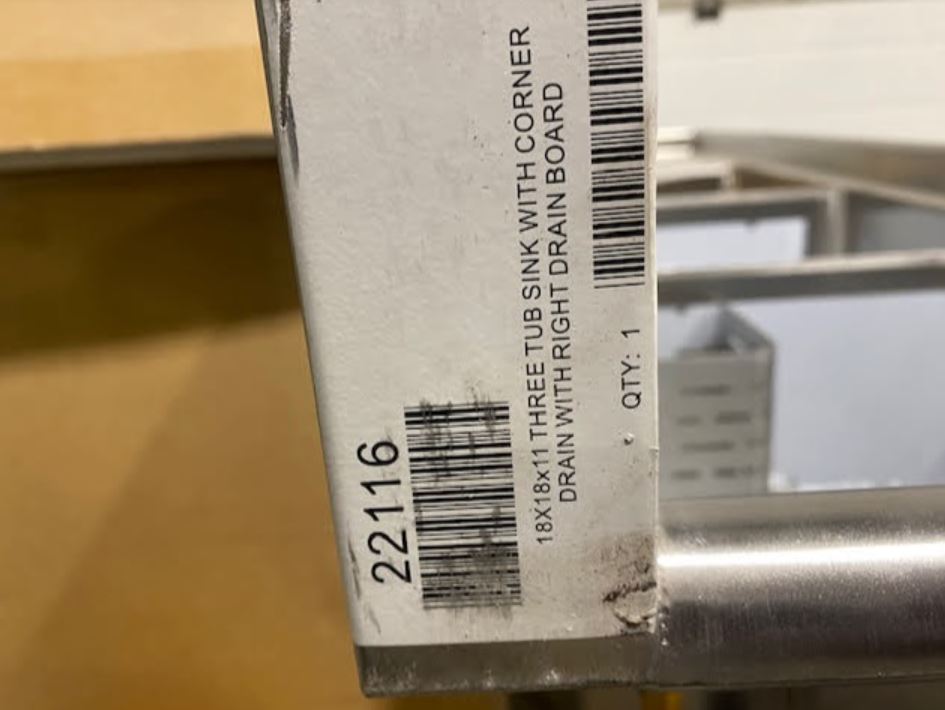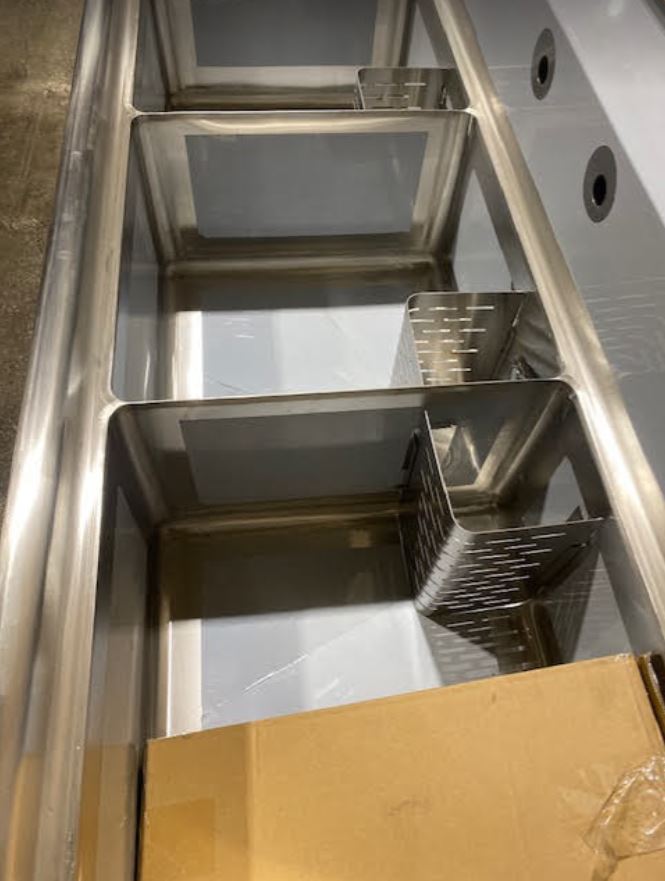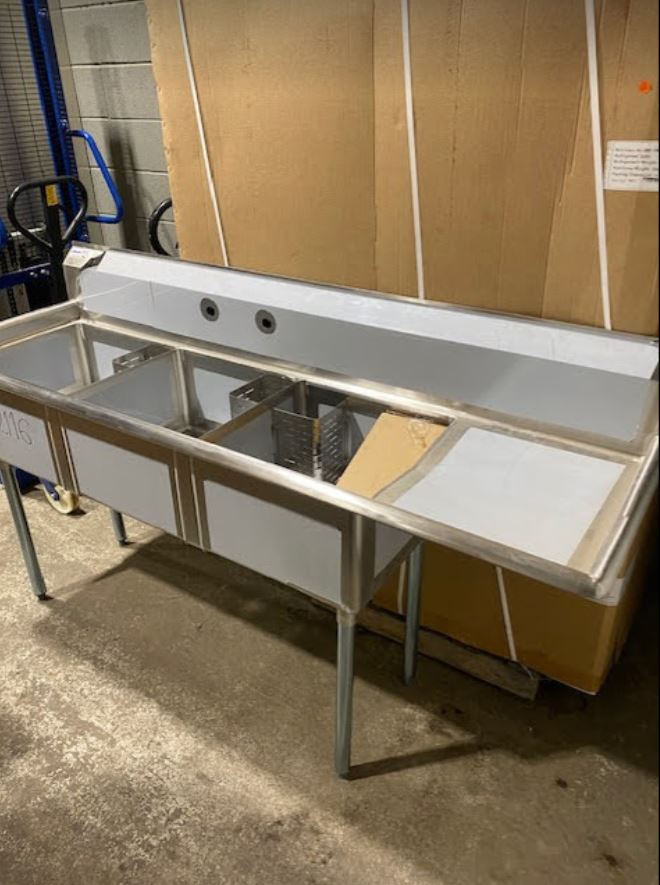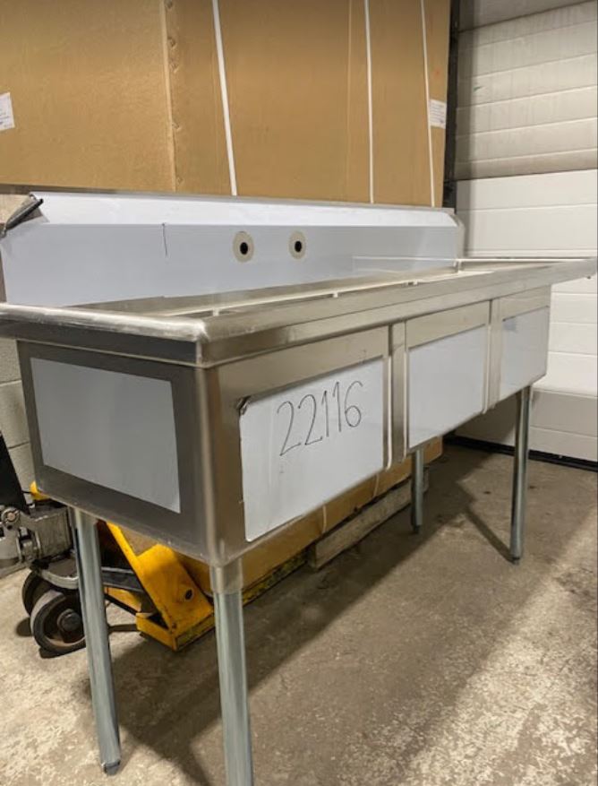 You are viewing a brand new never used stainless steel three compartment sink with right drain board corner sink drains, and drain baskets. This Omcan 22116 model is in excellent condition with a few very small scratches. It measures 75″ W x 23-1/2″ D x 44″ tall. The sink measures 18″ x 18″ x 11″ with a 1.8″ drain. We also sell other new models and have financing options. Our Clearance Warehouse is located in the Foothills Industrial Park #5, 6613 – 44th Street SE, Calgary, AB. Open Monday to Friday 9am to 5pm.