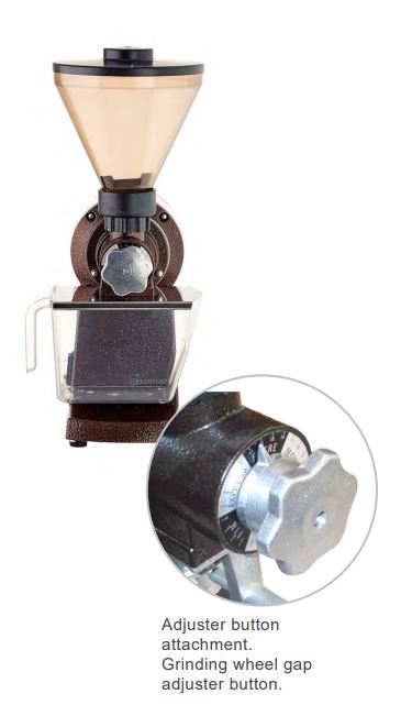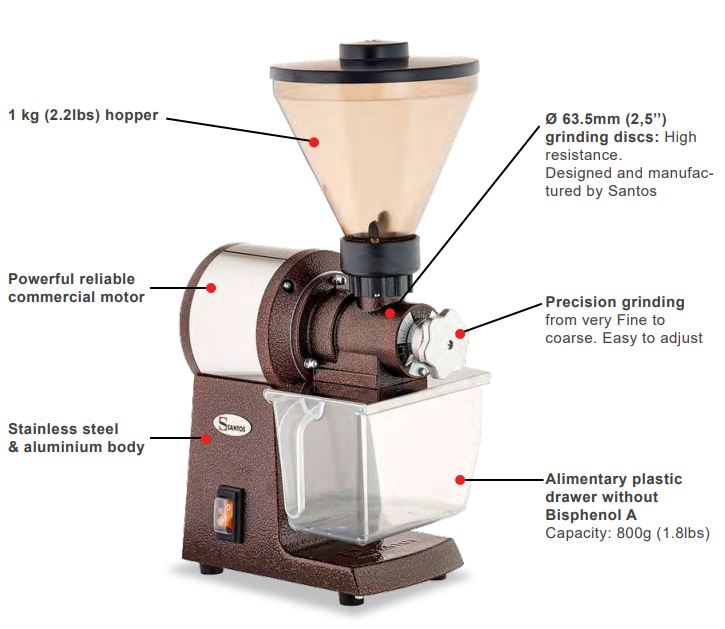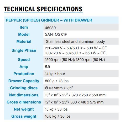 The Santos Heavy-Duty Pepper Grinder has a 2.2-pound (1kg) hopper size, adjustable grind settings, a removable plastic drawer, stainless steel and aluminum construction, and a brown finish. Ideal for shops, supermarkets, coffee roasters and bakeries.