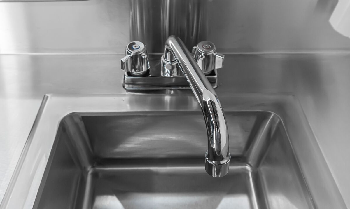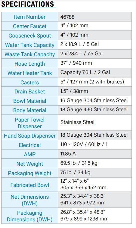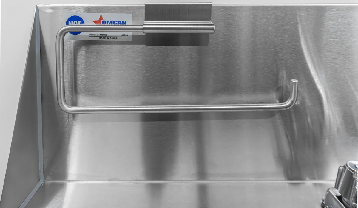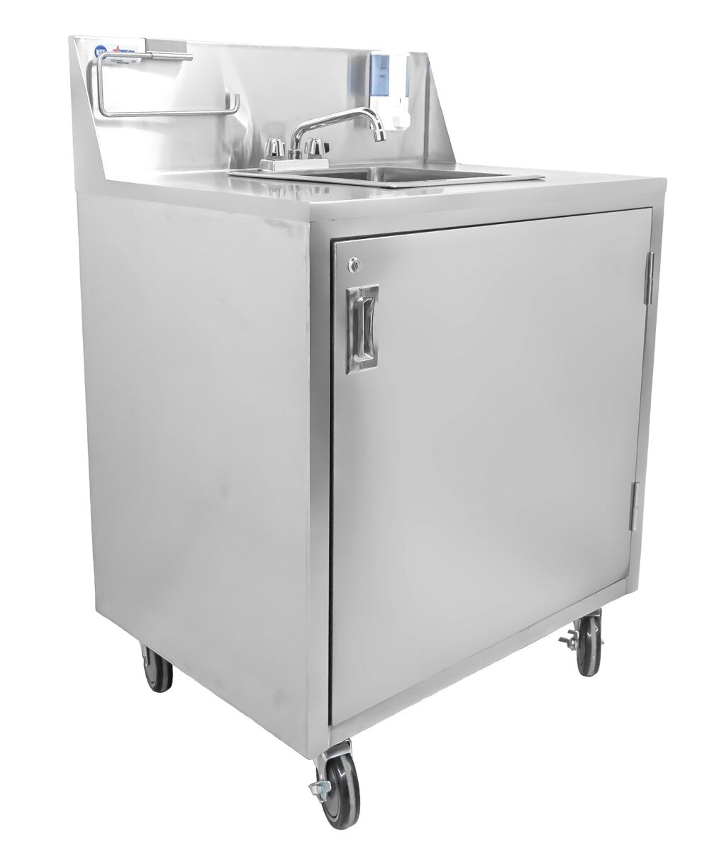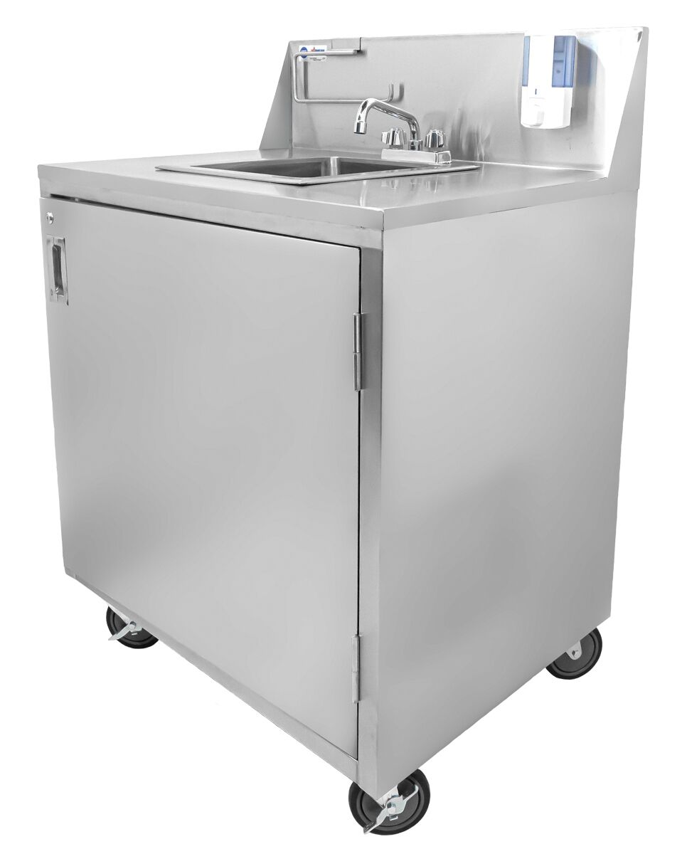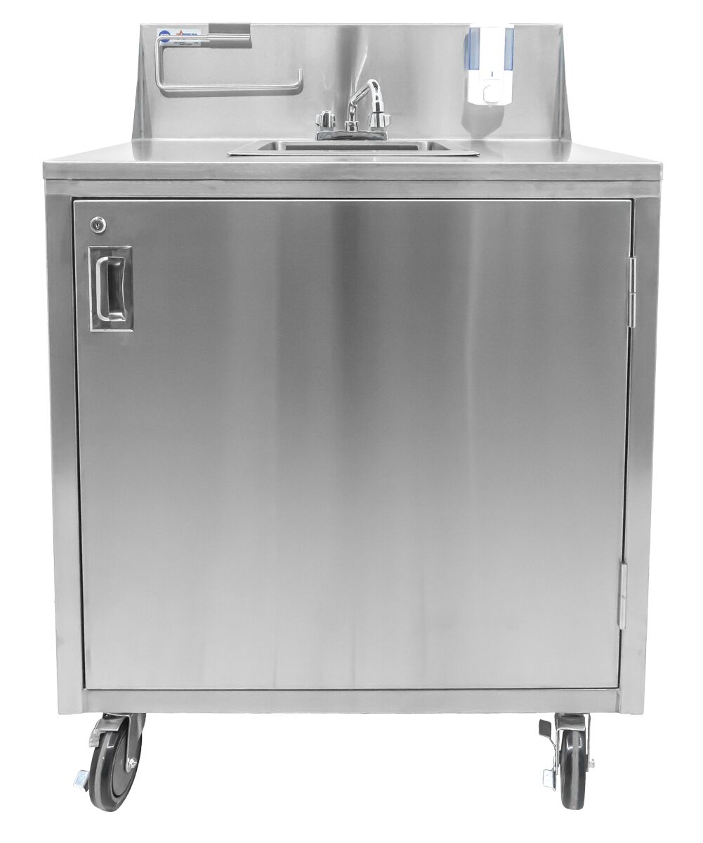 MATERIAL: 16 gauge 304 stainless steel fabricated bowl. top, backsplash. 18 gauge 430 stainless steel cabinet body, and swing door with recessed handle. Stainless steel paper towel dispenser. 18 gauge 304 stainless steel wall-mounted hand soap dispenser.