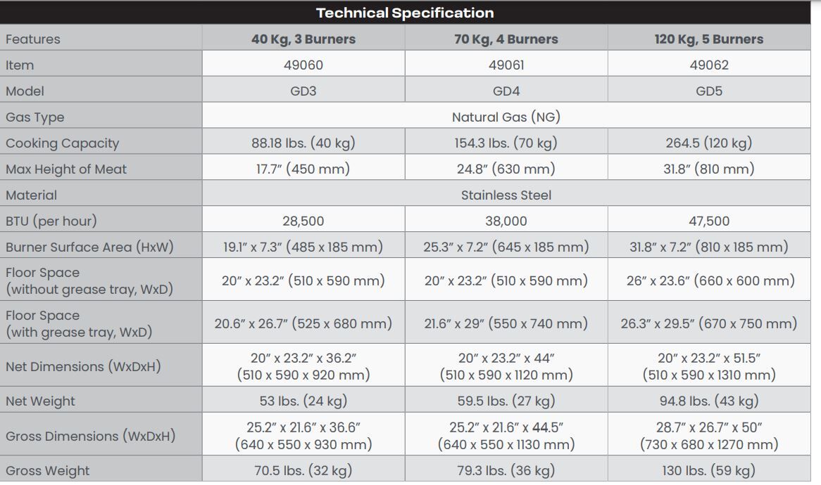 - BTU: With a robust BTU rating of 47,500 for Natural Gas, it provides the heat needed for perfect cooking.