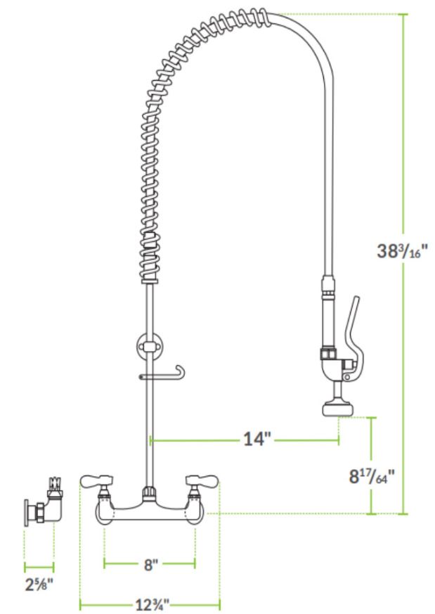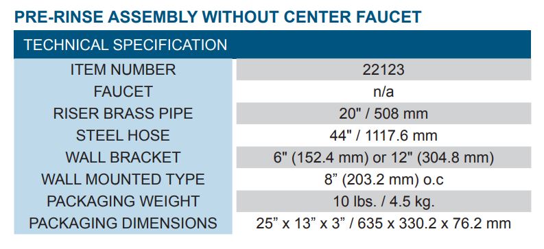 This pre-rinse assembly is best used in food service, commercial kitchens and restaurants. The riser brass pipe is 20″and the steel hose length is 44″. The wall bracket is 6″ or 12″ and the wall mounted type is 8″ oc. Center faucet is not included.