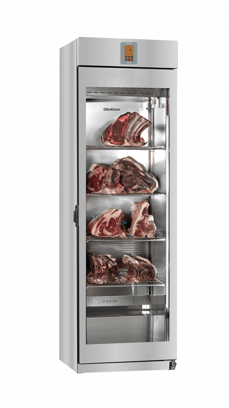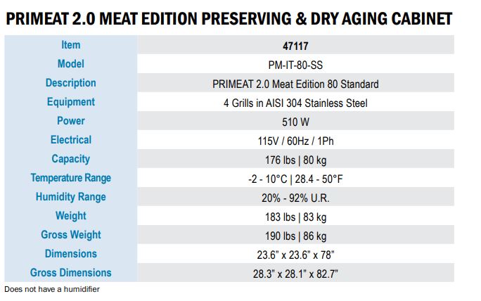 PRIMEAT 2.0 Meat Edition is a patented device that is manufactured in Italy. It specializes in the professional preservation and dry aging of meat while respecting food safety. The inner chambers are built of AISI 304 stainless steel with a scotch-brite finish that is food grade. Unlike other models, the ventilation system is made of AISI 304 stainless steel, which helps maintain a healthy environment inside the cabinet. The ventilation system is also designed to ensure uniform air distribution and helps prevent excessive dehumidification drying, creating a stable and food-safe microclimate. The dehumidification system ensures balance and safety that guarantees correct humidity for healthy conservation. PRIMEAT 2.0 Meat Edition does not require the use of large blocks of salt, or other sophistications, which could trigger the proliferation and the spread of harmful bacteria, in the product contained inside.