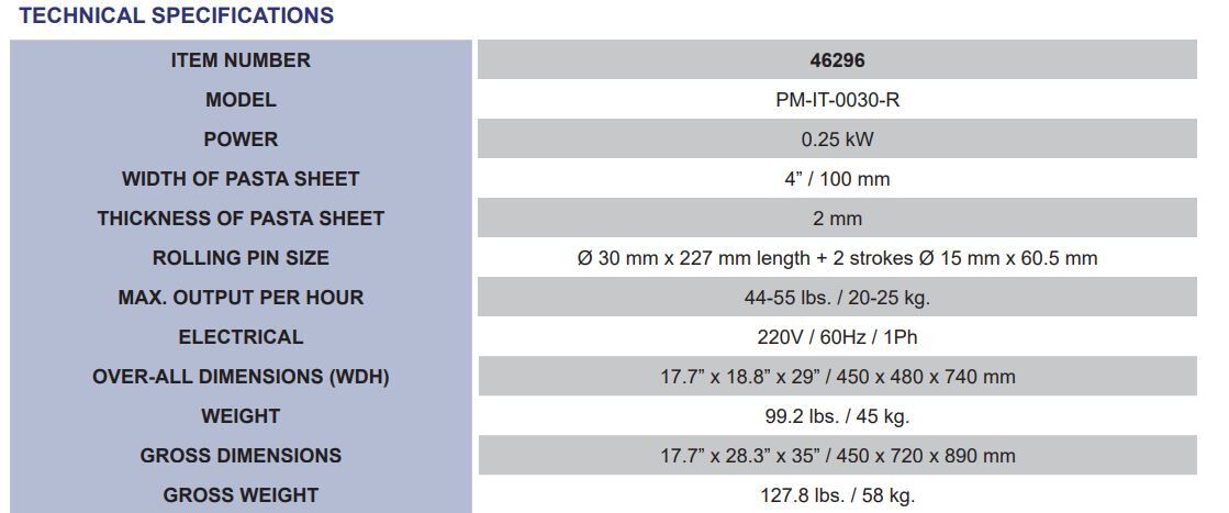 WIDTH OF PASTA SHEET: 4″ / 100 mm