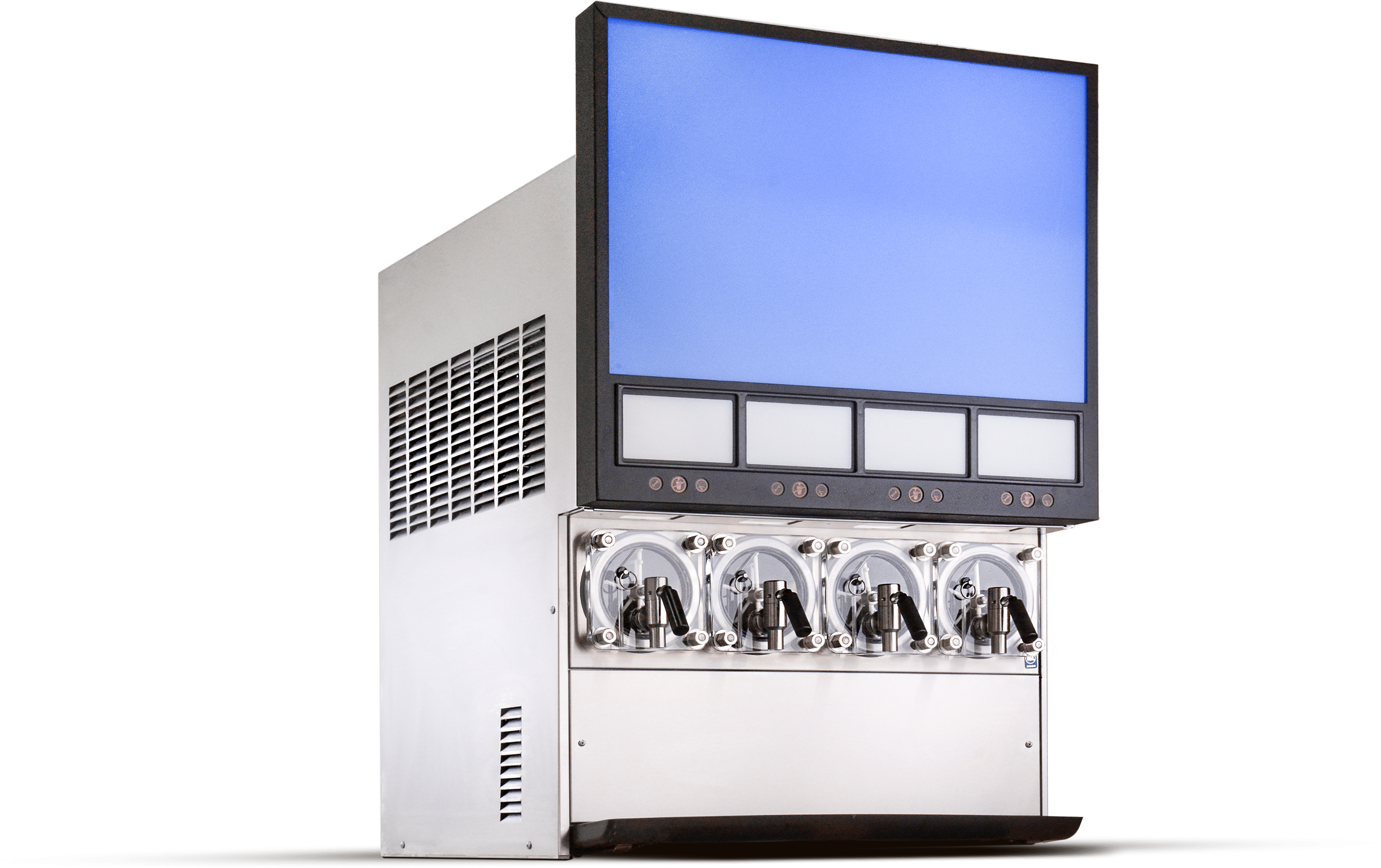 Viper™ Frozen Beverage Dispenser, carbonated, countertop, (4) flavors, self-contained refrigeration, air-cooled, (4) Motorman valves, Intelligent Defrost™, programmable sleep mode, short merchandiser (graphic & flavor cards sold separately), stainless steel side panels, R448A, 230v/60/1-ph, NEMA L6-30P, cULus, NSF, CE, ADA Compliant