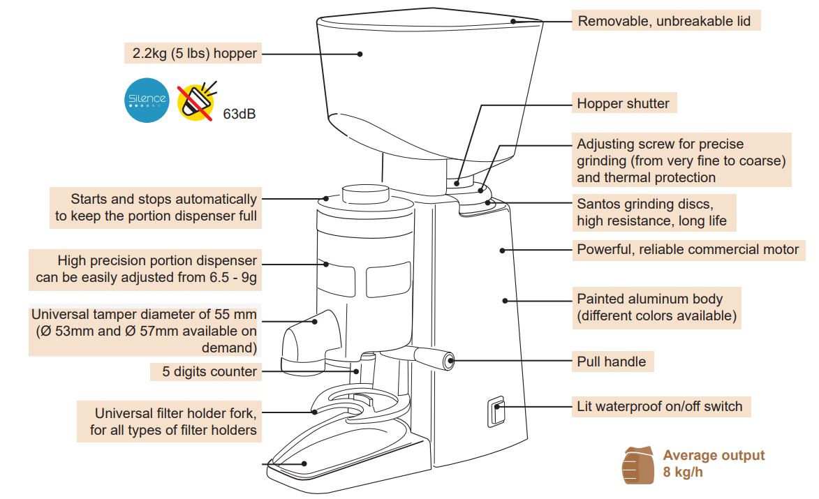 The espresso coffee grinder #40 is the ideal appliance for bars, hotels, restaurants who would like to serve a high quality espresso. This compact and silent grinder guarantees a fresh ground coffee with all its flavours, it stands beside the traditional 1,2, or 3 groups espresso machines.