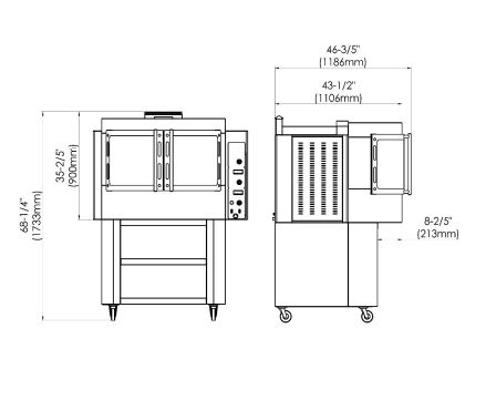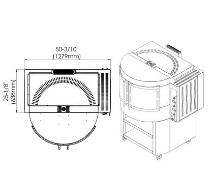 External dimensions: 50.5″ w x 43.0″ D x 65.8″ H with base / 1280 mm w x 2170 mm D x 1670mm H with base