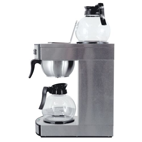 The Omcan Stainless Steel Coffee Maker with 2 Glass Decanter is a powerful and efficient brewing solution designed for commercial use, featuring a generous 2.2-liter tank that brews up to 100 cups per hour. It includes two glass decanters of 1.8 liters each, allowing for simultaneous serving. With a quick brewing time of approximately 5 minutes and an operating power of 1650 watts, it delivers consistent temperatures between 93°C and 96°C. Built from durable stainless steel, this coffee maker combines safety features like manual and auto thermostats with a sleek design, making it an ideal choice for cafes, restaurants, and offices looking to serve high-quality coffee efficiently.