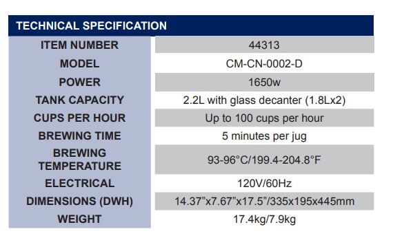 TANK CAPACITY: 2.2L with glass decanter (1.8L x 2)