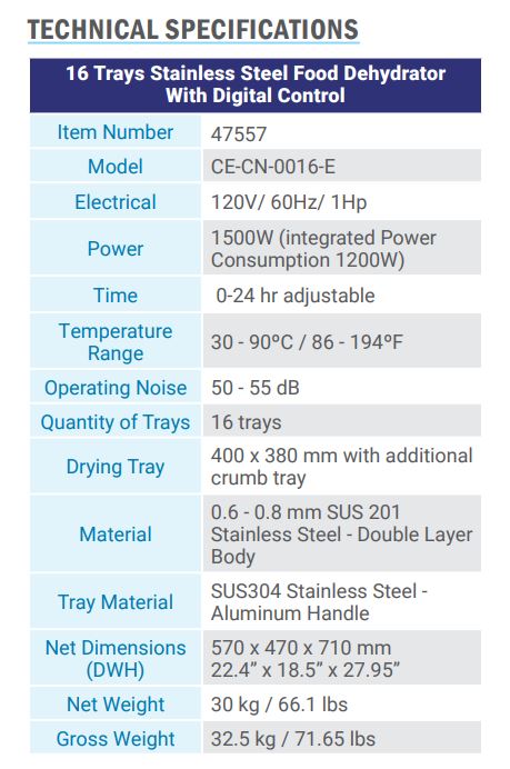 Omcan’s Food Dehydrator is perfect for making your healthy vegetable chips, fruit, snacks, meat jerky and bread crumbs. The machine is designed with an accurate time and temperature digital touchscreen controller which makes it efficient to operate. This commercial dehydrator is an excellent solution to retain flavours of your food without the need for additives and preservatives, allowing you to provide healthy food choices for your customers.