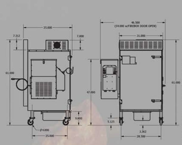 Outside Dimensions: 46.5”W (54.5″W/firebox door open) x 61”H x 35”D