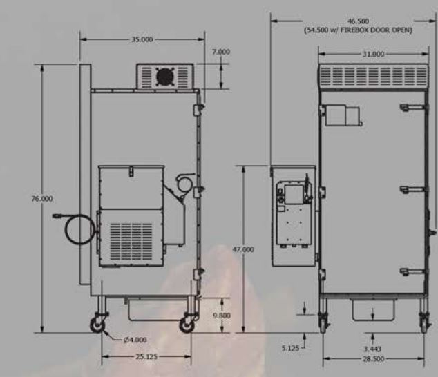 Outside Dimensions: 46.5”W (54,500″W/firebox door open) x 76”H x 35”D