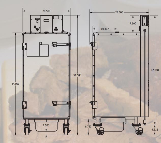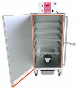 Standard Equipment: 5 grills, side racks, drip pan, wood box, wood box handle, casters, operator’s manual, cookbook, 10 lbs. wood, spare heating element and Cookshack Spice Kit
