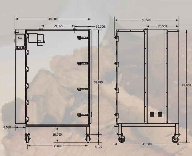Standard Equipment: 28 grills, side racks, wood box, wood box handle, casters, operator’s manual, cookbook, 20 lbs. wood, spare heating element and Cookshack Spice Kit