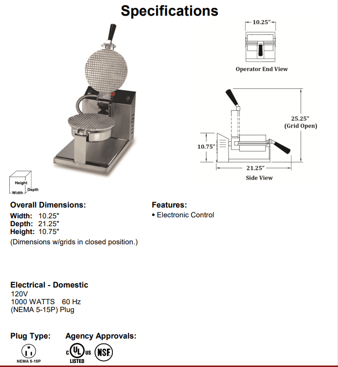 Freshly baked waffle cones will create an aroma no customer will be able to resist. The Standard Giant Waffle Cone Maker #5020 is just what your business needs. The waffle cone maker features an 8″ waffle cone grid. Waffle cones will be baked to perfection using this giant waffle cone maker at ice cream shops and concession stands.