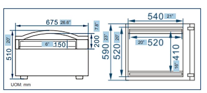 CHAMBER DIMENSIONS: 21.25″ x 20.47″ x 7.87″ / 540 x 520 x 200 mm