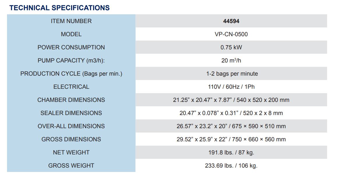 APPROXIMATE CAPACITY THE VACUUM PACKAGING CAN HOLD: 40 kg.