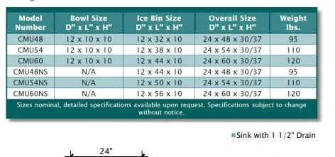 Cocktail Mix Unit, with sink & cover, 60″W x 24″D, 7″H backsplash, 10″ deep insulated ice bin, 10″W x 12″ front-to-back x 10″ deep sink bowl with 4″ OC deck mount faucet holes, removable speed rail on front, undershelf, stainless steel construction, stainless steel legs with adjustable bullet feet, NSF