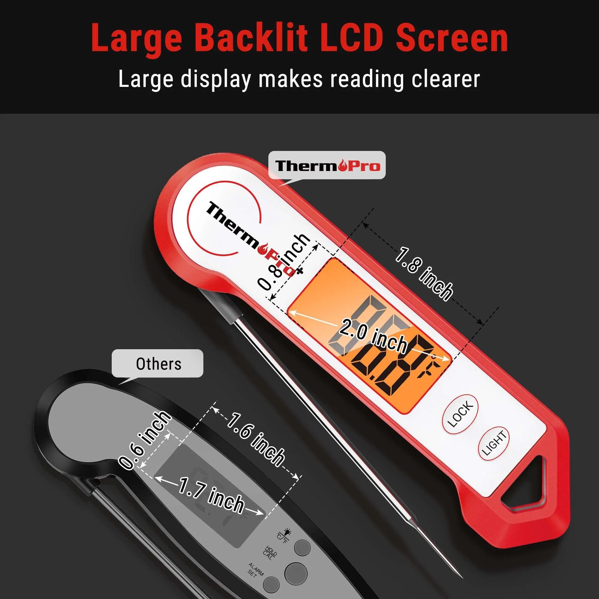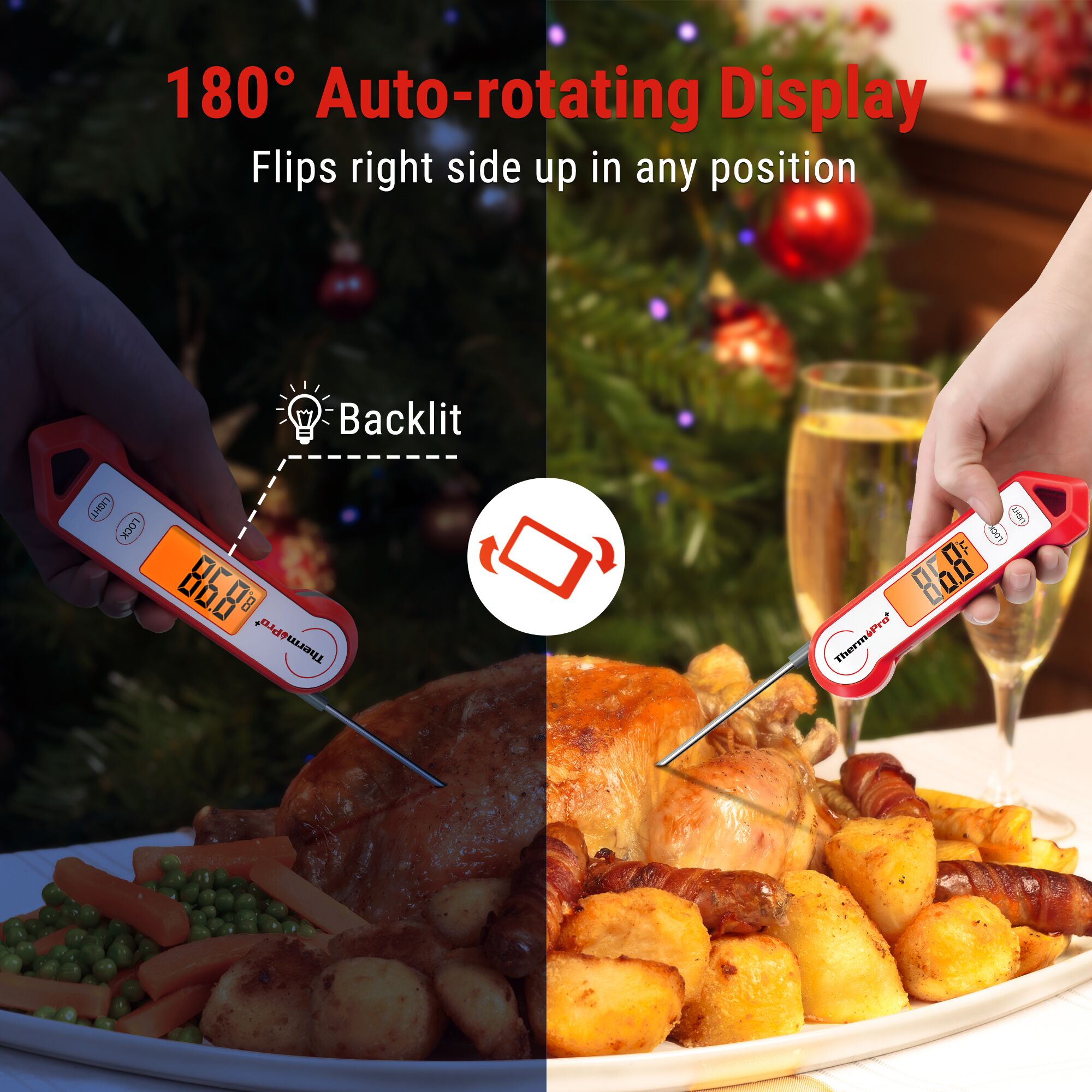 large LCD backlit display The instant read thermometer has a 180° auto-rotating backlit display, making this kitchen thermometer perfect and make sure you use it in low light conditions.