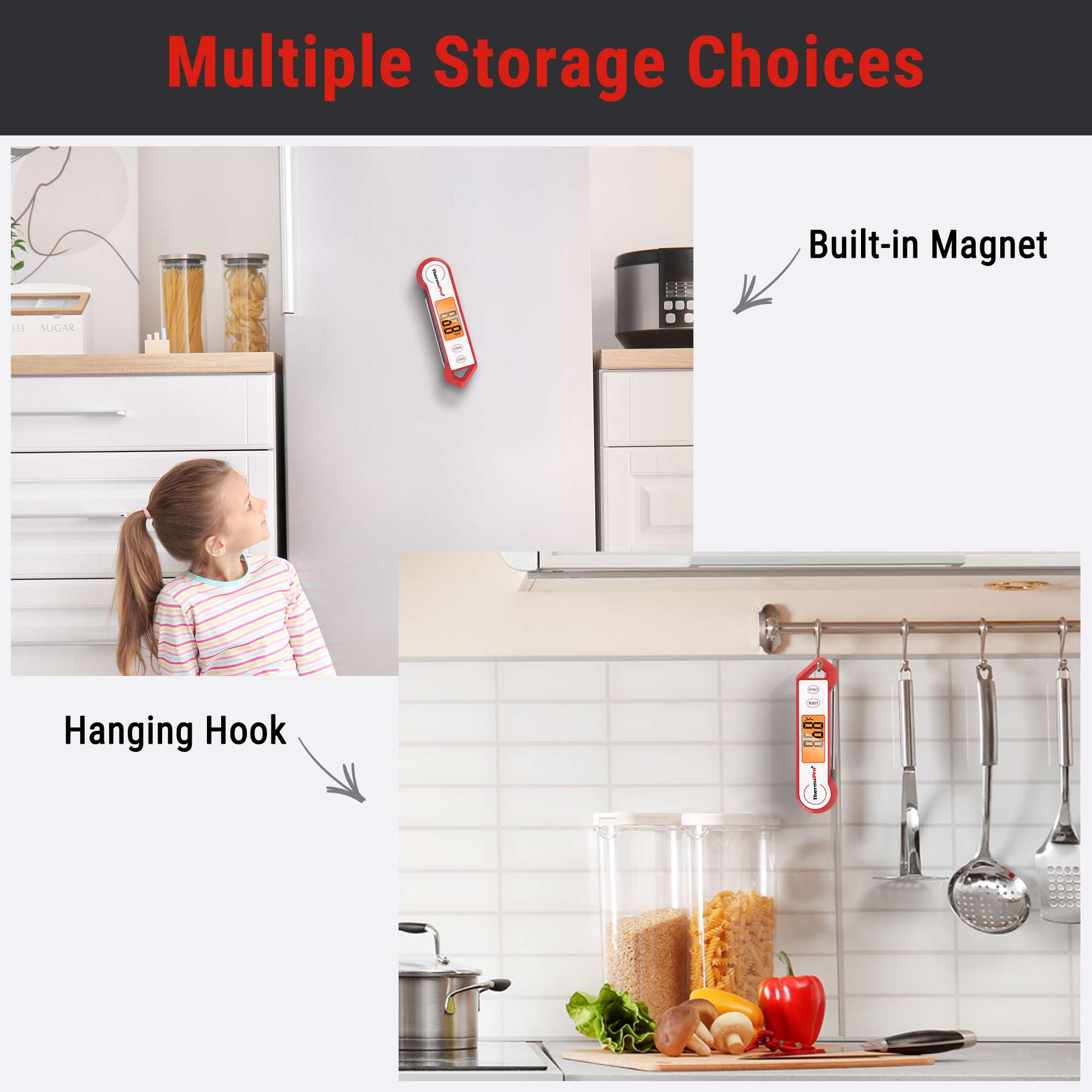 Magnetic back This instant read thermometer for cooking with magnetback allows for placement on any metal surface or use the hang hole for hooks