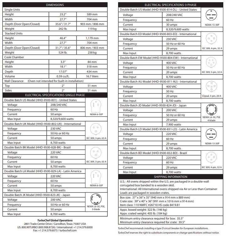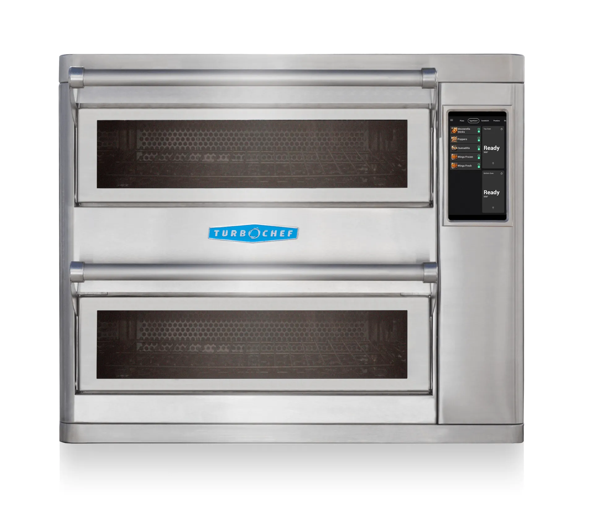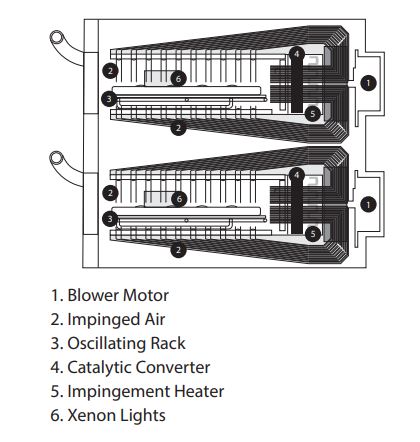 The Double Batch oven has two independent cavities that circulate impinged air at speeds of up to 50 mph to create high heat transfer rates and reduced cook time. The oven utilizes variable speed blowers, oscillating racks, and catalytic converter, resulting in minimal energy input, high food quality, and ventless operation.